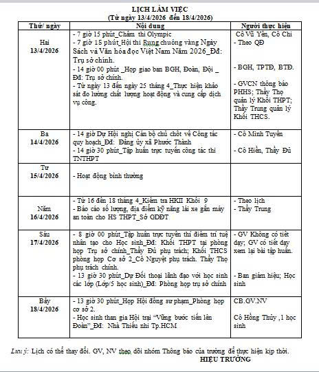 Kế hoạch số 189/KH-THCS-THPTNH ngày 14/04/2026 của trường THCS và THPT Nguyễn Huệ về việc Đối thoại giữa Ban Giám hiệu với học sinh - Năm học 2025-2026