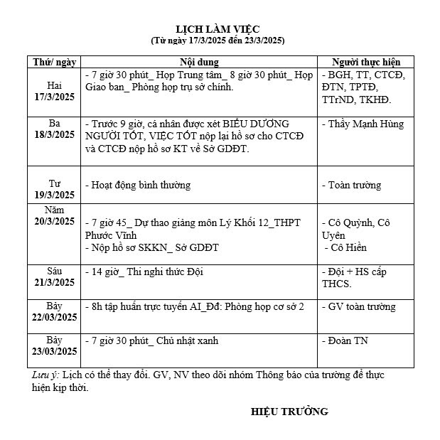 Lịch làm việc Tuần 28, từ ngày 17/3/2025 đến ngày 23/3/2025