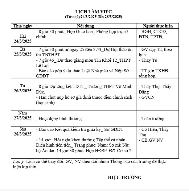 Lịch làm việc Tuần 29, từ ngày 24/3/2025 đến ngày 28/3/2025