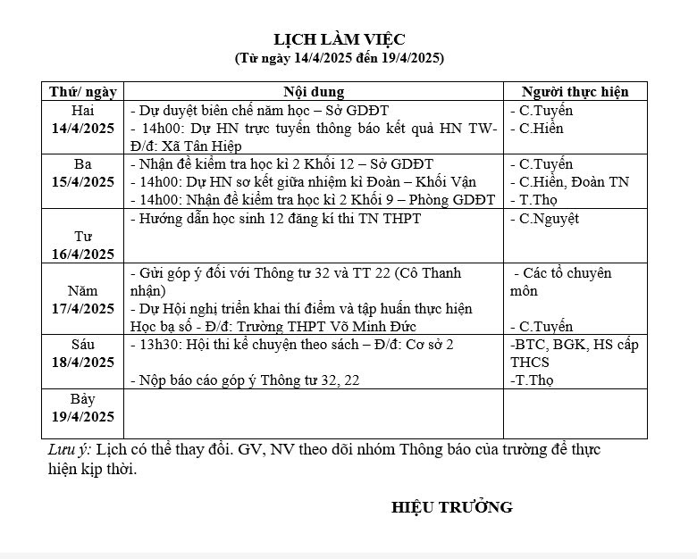 Lịch làm việc Tuần 32, từ ngày 14/4/2025 đến ngày 19/4/2025