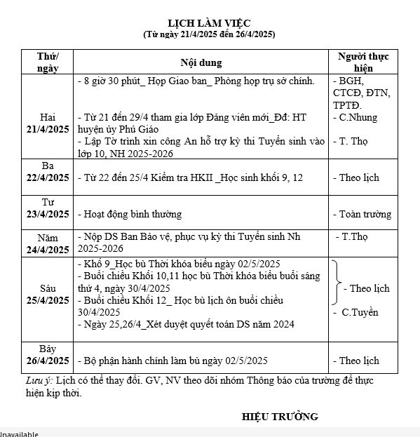 Lịch làm việc Tuần 33, từ ngày 21/4/2025 đến ngày 26/4/2025