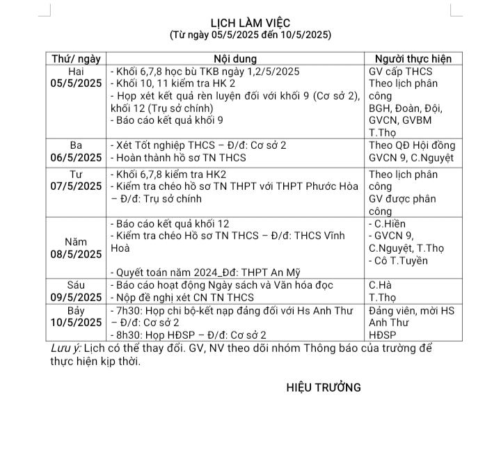 Lịch làm việc Tuần 35, từ ngày 05/5/2025 đến ngày 10/5/2025