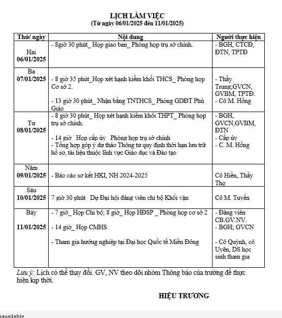 Lịch làm việc Tuần 19, từ ngày 06/01/2025 đến ngày 11/01/2025