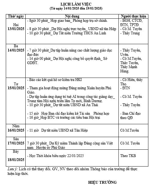 Lịch làm việc Tuần 20, từ ngày 13/01/2025 đến ngày 18/01/2025