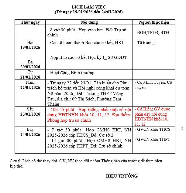 Lịch làm việc Tuần 20, từ ngày 19/01/2026 đến ngày 24/01/2026