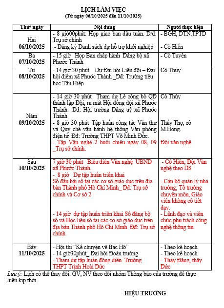 Lịch làm việc Tuần 05, từ ngày 06/10/2025 đến ngày 11/10/2025