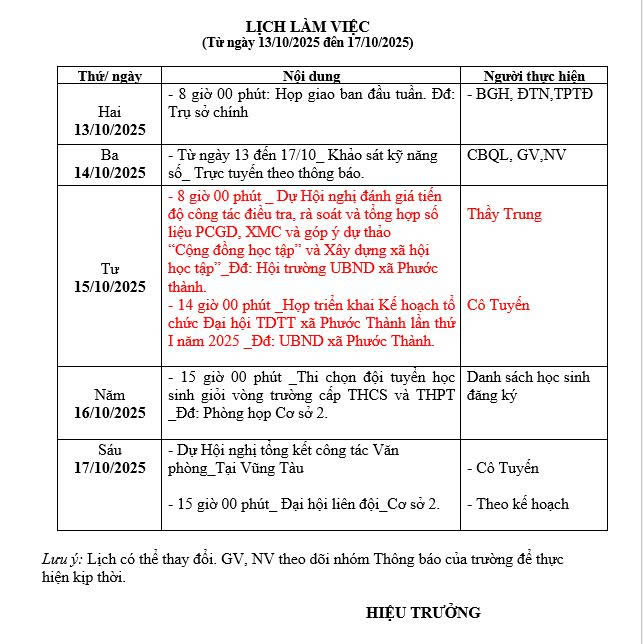 Lịch làm việc Tuần 06, từ ngày 13/10/2025 đến ngày 17/10/2025