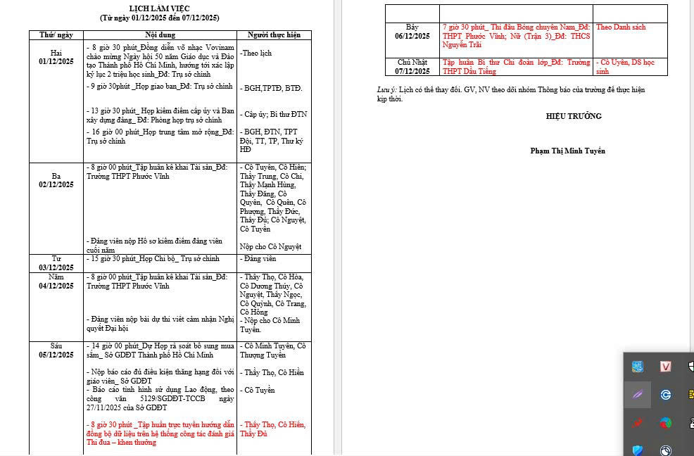 Lịch làm việc Tuần 13, từ ngày 01/12/2025 đến ngày 05/12/2025