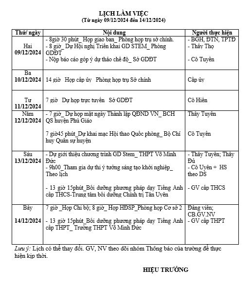 Ghi chú: Lịch làm việc Tuần 15, từ ngày 09/12/2024 đến ngày 14/12/2024