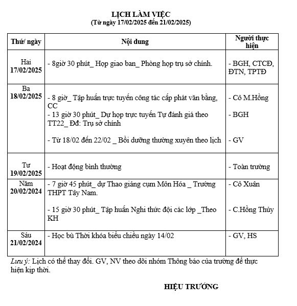 Lịch làm việc Tuần 24, từ ngày 17/02/2025 đến ngày 21/02/2025
