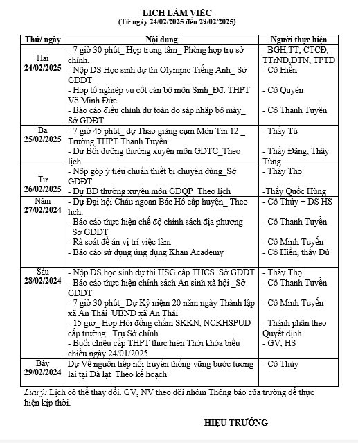 Lịch làm việc Tuần 25, từ ngày 24/02/2025 đến ngày 29/02/2025