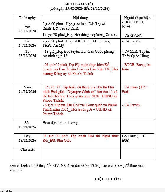 Ghi chú: Lịch làm việc Tuần 23, từ ngày 23/02/2026 đến ngày 28/02/2026
