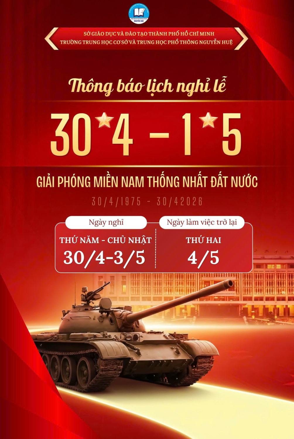 Kế hoạch số 190/KH-THCS-THPTNH ngày 14/04/2026 của trường THCS và THPT Nguyễn Huệ về việc TUYÊN TRUYỀN KỶ NIỆM 51 NĂM NGÀY GIẢI PHÓNG MIỀN NAM THỐNG NHẤT ĐẤT NƯỚC (30/4/1975 – 30/4/2026)